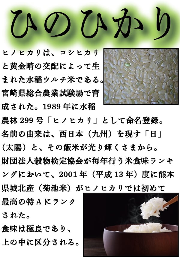 品種ひのひかりは九州熊本県を中心に中国・四国地方や近畿地方など西日本で広く栽培されている。名前の由来は、西日本(九州)を現す「日」(太陽)と、その飯米が光り輝くさまからきています。
